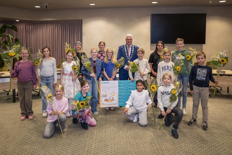 Op de foto staan v.l.n.r. Fabiënne, Silvi, Leonie, kinderburgemeester Rian, Feline, Willemijn, Benthe, burgemeester Jan Zwiers, Fenn, Alisa, Maud, Syb en Ruben en daarvoor v.l.n.r. Roos, Hannah, Limar en Alex.